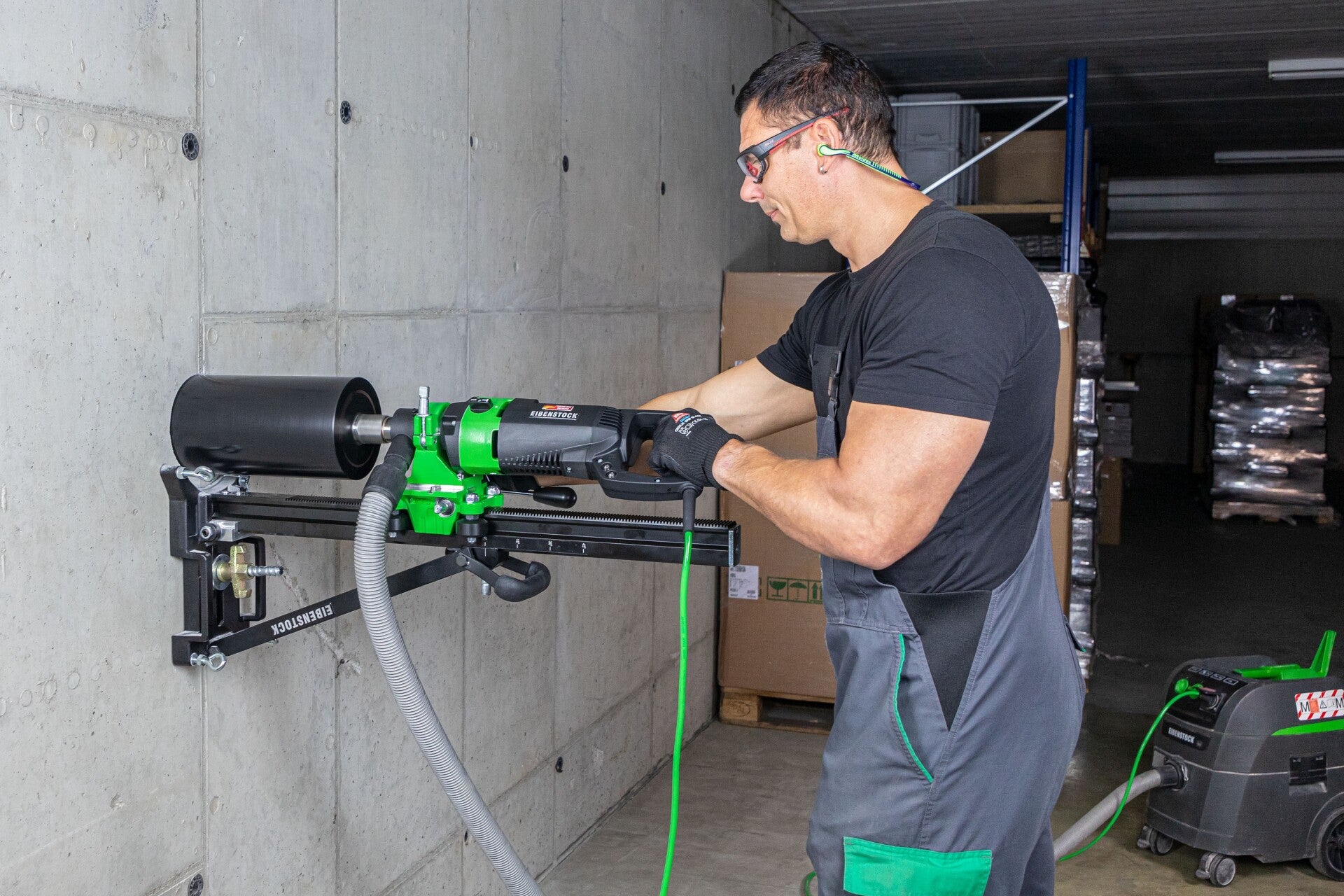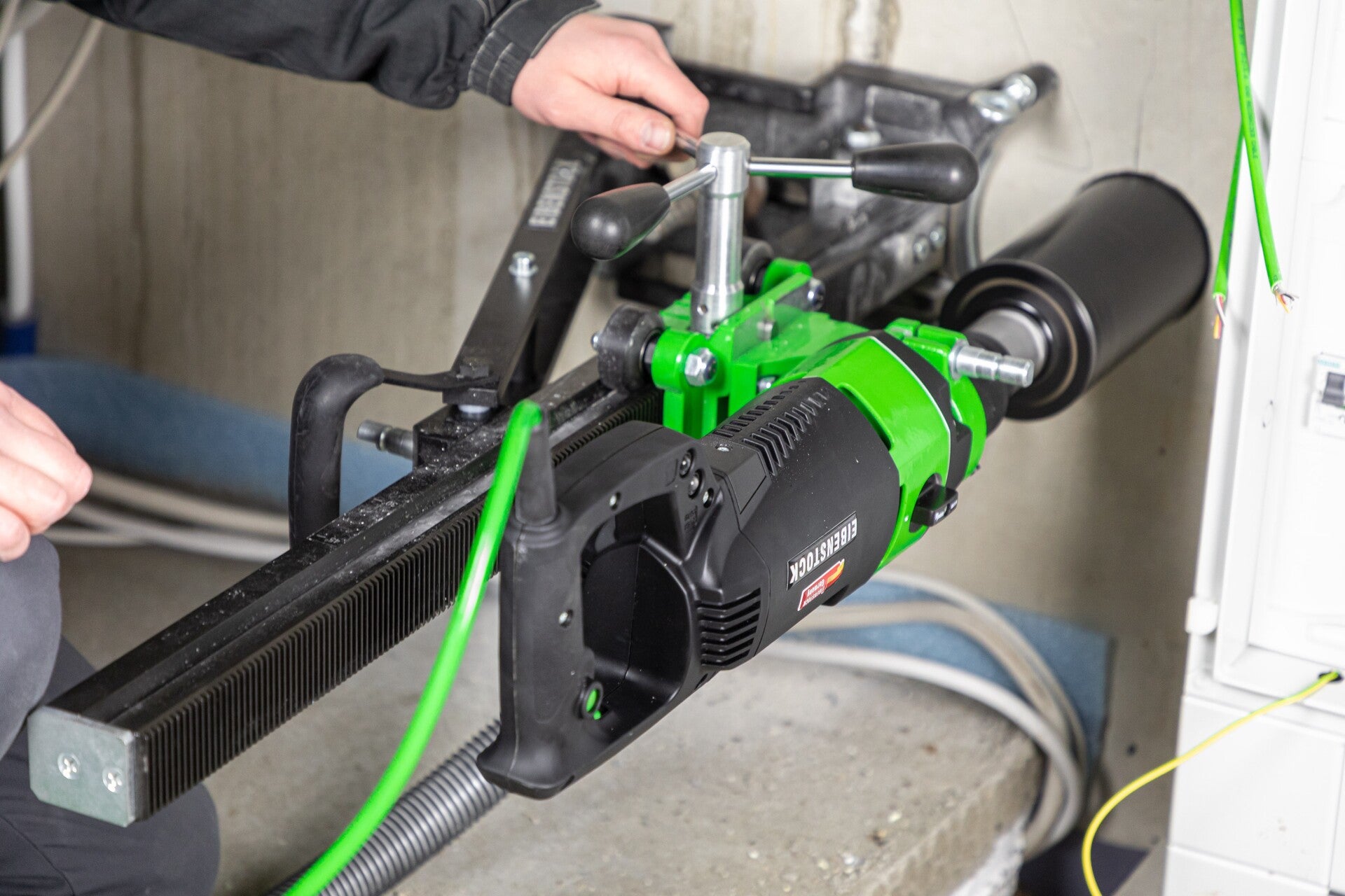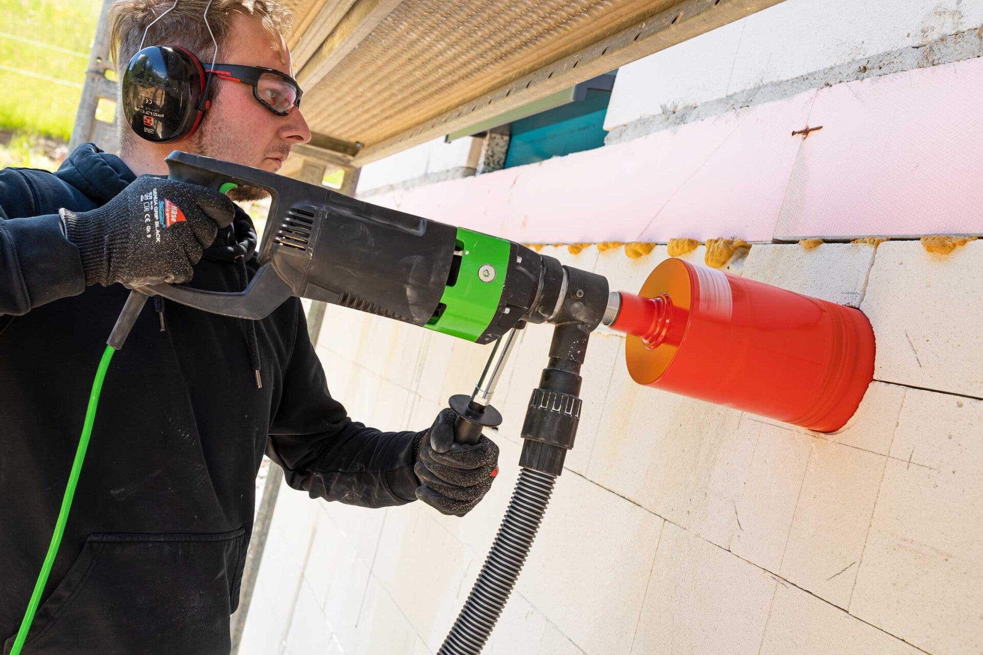 - Trockenbohren bis Ø 162 mm in besonders harte Materialien, z.B. hochverdichteten Kalksandstein, armierten Beton und Mauerwerk mit hoher Arbeitsgeschwindigkeit (Ø 202 mm nur in Mauerwerk)
