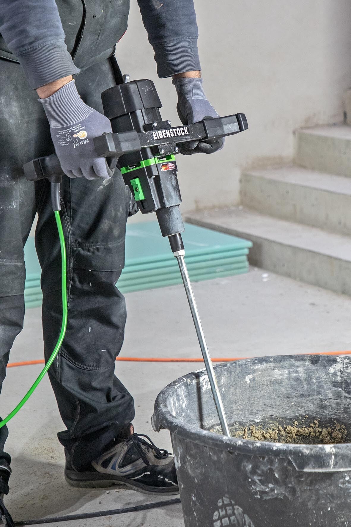 - Mischen von Baustoffen mit mittlerer und hoher Viskosität, z.B. Spachtel- und Ausgleichsmassen, Fliesenkleber, Fertigmörtel, Fertigputz, Estrich